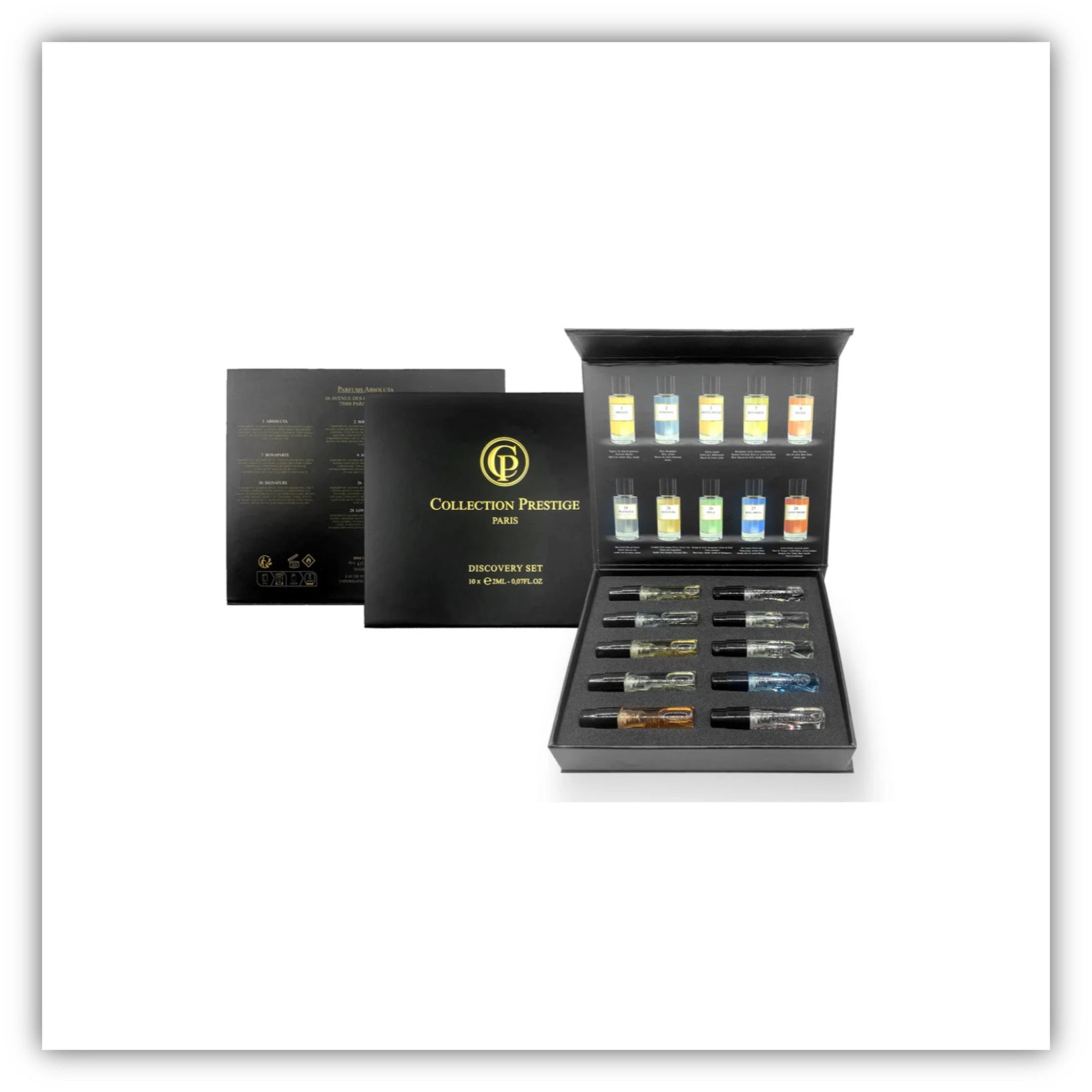 De Discovery Set van Collection Prestige Paris is een luxe doos met 10 parfummonsters van elk 2 ml, gepresenteerd in een elegante zwart-en-gouden doos. Ideaal om het assortiment geuren van het merk te ontdekken en te verkennen.